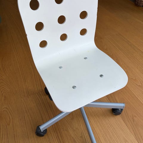 IKEA Jules barnestol/kontorstol med blått sete og rygg, og hvitt understell med hjul og hev/senk. Egnet ved skrivepult eller bord.