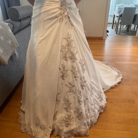Nydelig vakker brudekjole med snøring selges. Inkluderer underkjole, brudeslør, bolero og morgenskåpe. Kjolen og tilbehøret er nyrenset og klart for bruk. Kjolen passer en s-m etter som det er snøring bak. Passer til dame som er ca 170-175 høy. Ta kontakt på tlf 98682836 ved spørsmål, eller en melding her på finn. Kjolen kan prøves om ønskelig. Kostet ca 20000 brukt. Pris kan diskuteres