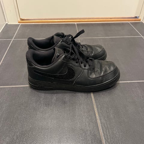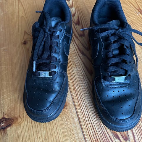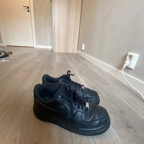 Nike Air Force 1 sneakers i størrelse 42. Modellen er i helsvart skinn med sort yttersåle og klassisk Nike Air-demping. Overdelen har perforeringer i tåpartiet for ventilasjon, og skoene har snøring med metallmerke på lissene. Passer som hverdagssko eller fritidssko.