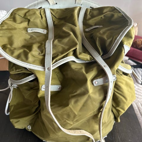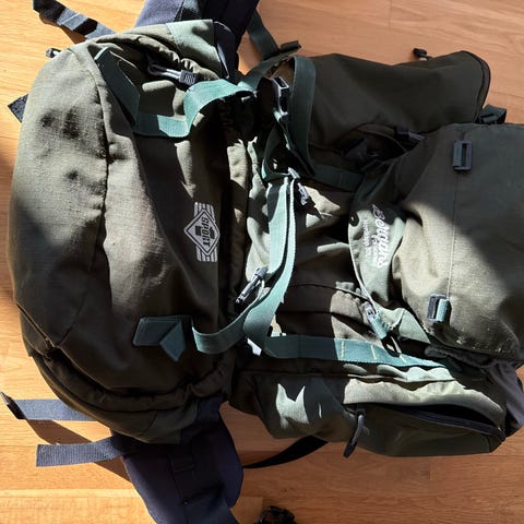 NFM ryggsekk i Forsvarets kamuflasjemønster. Sekken er helt ubrukt og størrelsen anslås til 80-100 liter. Sekken har delt hovedrom og avtagbare sidelommer (med glidelås). Polstret bæresystem, brystrem og hoftebelte. Selges for kr 600,-. Ved forsendelse tilkommer kr 130,- i frakt. Oppgjør på Vipps.