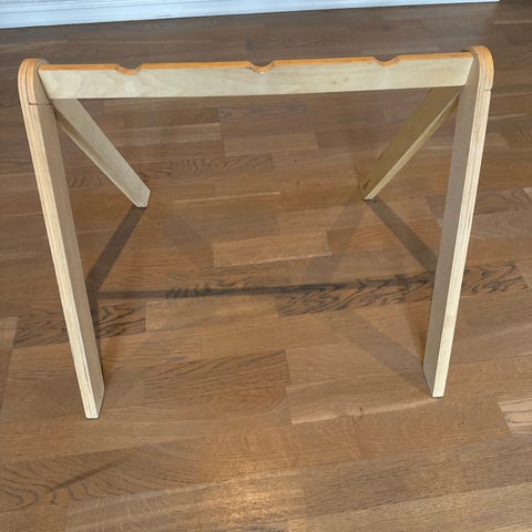 Babygym stativ i tre fra Moulin Rorty. Består av flere runde trestenger som settes sammen til et stativ med fire ben og en tverrstang til å henge leker på. Se bilder. Egnet som aktivitetsstativ over leketeppe eller lignende for spedbarn og små barn. Ubetydelige bruksmerker, den er stabil og fungerer som den skal.