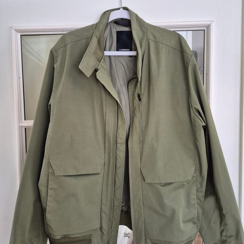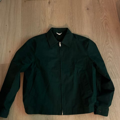 H&M jakke for herre i størrelse XL. Jakken er grønn og laget i bomull. Den har glidelåslukking foran, skrålommer i sidene og snøring nederst. Kragen er i et annet materiale med kordfløyelspreg, i en mørkere kontrastfarge. Passer som hverdagsjakke eller lett ytterjakke i overgangssesonger.