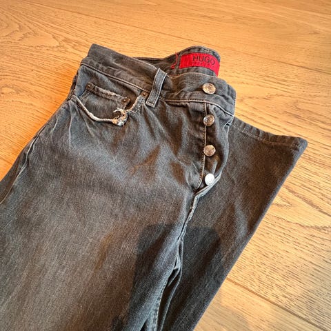 Bukse i svart: Fra Brax i størrelse M med livvidde W31. Buksen er i svart denim. Egnet som hverdagsbukse eller til mer formelle anledninger avhengig av styling. Klassisk femlommersmodell med beltehemper og knapp-/glidelåslukking. Materialet i denim gir et slitesterkt og strukturert uttrykk.