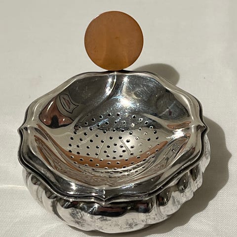 Vakker og dekorativ teholder/-sil i nysølv.