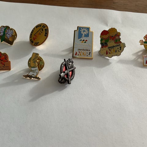 Samling med ulike vintage emaljepins og buttons i forskjellige motiver, farger og størrelser. Blant motivene finnes blant annet Nordisk Skolejogg «Løp for Afrika 1986», reklamepins, figurmotiv og organisasjonsmerker. Pinsene er hovedsakelig i metall med emalje, mens buttonene har trykk på front. Egner seg for samlere av pins, buttons og nostalgiske merkevarer, eller til bruk på jakker, vesker og lignende.