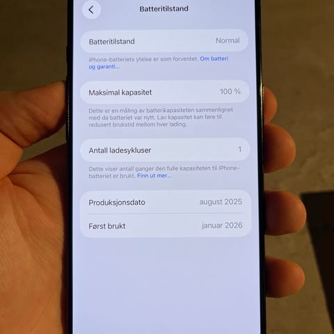 - Batteri: Batteritilstand og maksimal kapasitet fremgår av bilde, 96%