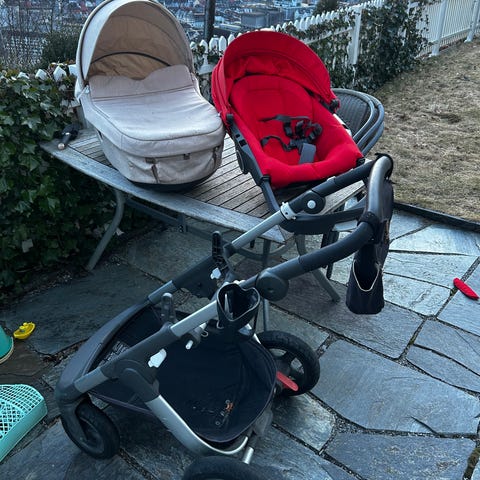 "sykkeltilhenger/sete" for barnevogn. Tilbehør som festes bak på en vogn fra skråstag for å gi plass til et barnesete. Modellen har buet ramme, håndtak foran. Utstyrt med to hjul bak og ett festepunkt i vogn. Fotstøtte. Passer trolig til bruk sammen med vogner med rundt skråstag