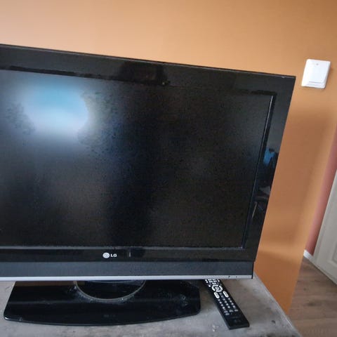 LG TV i svart farge. TV-en med original fjernkontroll, strømkabel og har tilkoblingsmuligheter på baksiden for blant annet HDMI og andre innganger som vises på bildene. Passer til vanlig TV-bruk i stue, soverom eller andre rom der det er behov for en enkel TV-løsning.