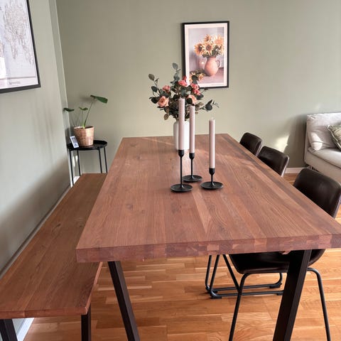 Spisebord med tilhørende sittebenk i Massiv Eik og med sort metall understell. Meget pen spisegruppe i meget god kvalitet. Jeg har i tillegg 4 stoler i sort velur til salgs , de kan fint benyttes til gruppen. De selges utenom til 400'pr stk. Noen bruksmerker på bord/benk er det men de glir fint inn i mønster og sjatteringer i bordet/benken (se bilder). Lengde 220 cm, Bredde 100 cm, høyde 76 cm. Følger med 1 ileggsplate 50 cm. Dersom flekkene på bord/benk er til sjenanse så er det fullt mulig å slipe bordet da det er massivt. Obs det er veldig tungt og ved salg må det skrues fra understellet for frakt. Kan hentes medio april.