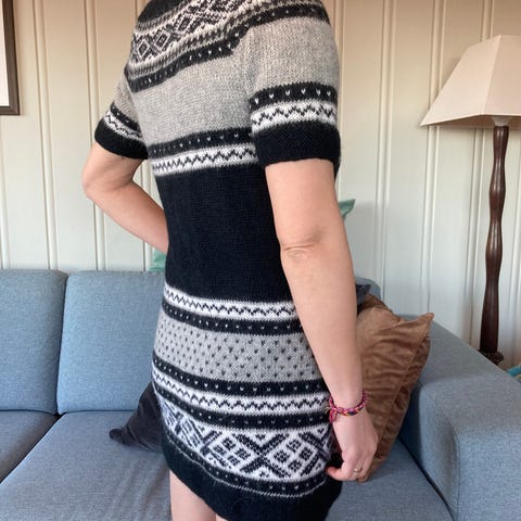 Håndstrikket genser og skjørt med Mariusmønster. Størrelse S.