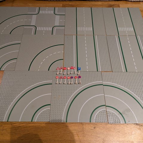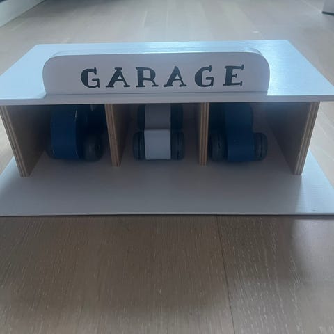 Gammel bilbane i tre. Består av flere puslespill-lignende biter som kan settes sammen til ulike baner, for eksempel oval eller firkantet form. Enkelte deler viser tegn til slitasje og mindre skader, som avskalling i kant og sprekk i kasse/plate