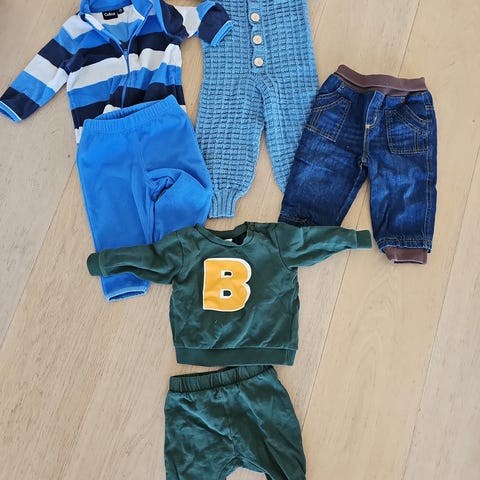 Bukser og antisklisokker str 16-18 for gutt i størrelse 74. Pakken inneholder flere bukser i blåtoner samt antisklisokker med mønster. Klærne passer til baby/gutt rundt størrelse 74 og er egnet til hverdagsbruk inne og ute. Materiale er typisk myk tekstil egnet for barneklær (blandingsmateriale, nærmere sammensetning ikke oppgitt).