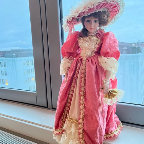 Porselensdukke med langt, krøllet hår og detaljert antrekk. Dukken har lang rosa kjole med volanger og blonder, samt blomstrete ytterkappe. Stor matchende hatt i lys rosa/beige stoff.