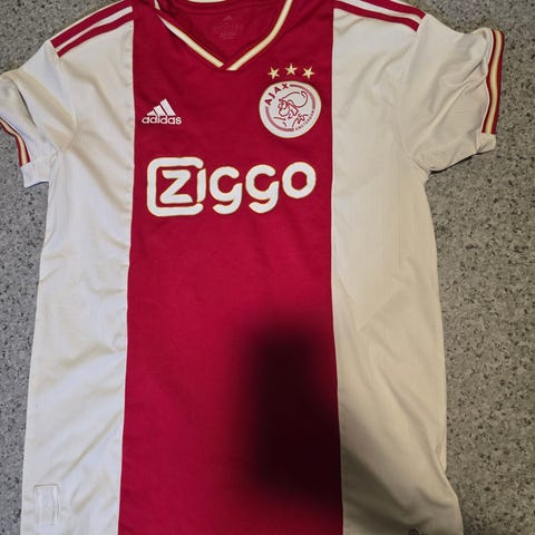 Adidas Ajax fotballdrakt i størrelse S. Drakten er hvit med flerfarget grafisk mønster og mørke detaljer. Ajax-klubbmerke og sponsorlogo foran, samt Adidas-logo på brystet. AEROREADY-merket stoff som er utviklet for å transportere fuktighet bort fra kroppen. Kortermet modell egnet til fotball og annen trening.