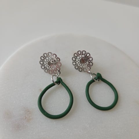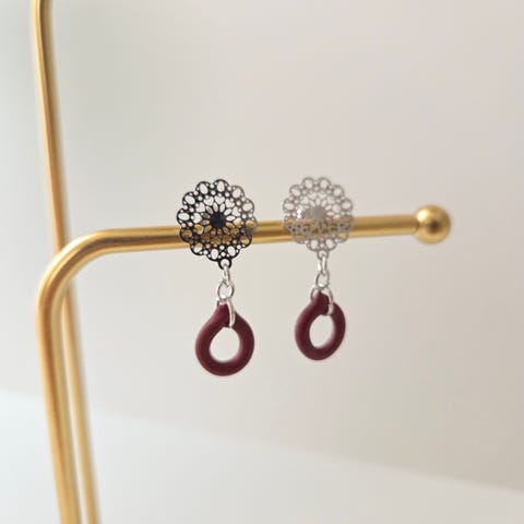 Øredobber i stål med dekorativ, utskåret blomsterformet topp og hengende blå perle laget av polymerclay. Festes i øret med stift og bakdel.