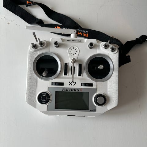 Selger en FrSky Taranis Q X7 radiokontroller/RC-sender. Populær sender til FPV-droner, fly og annet radiostyrt. God ergonomi, mange brytere og presise stikker.