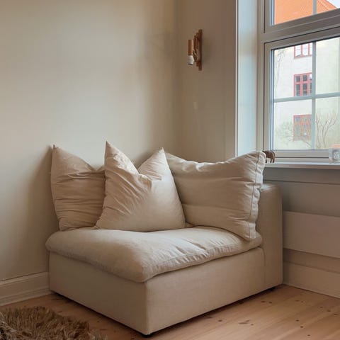 Beige sofa kjøpt fra Trademax. Består av tre moduler. To puffer/pall som kan brukes både som adskilte puffer eller forlengelse av sofaen som Divan! Selges da de er for store for stuen. De kan selges med eller uten puffene. Pris uten puffene 7.000kr med puffene 12000kr. Brukt og muligens behov for en god rens, ingen dyr i hjemmet. Ingen synlige skader, men bes ses først. Modulene hver på 90x 90cm(med ryggstøtte 110cm i dybde) og 38cm i høyde. Ved rask henting, kan pris diskuteres.