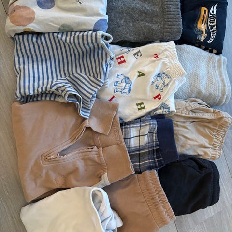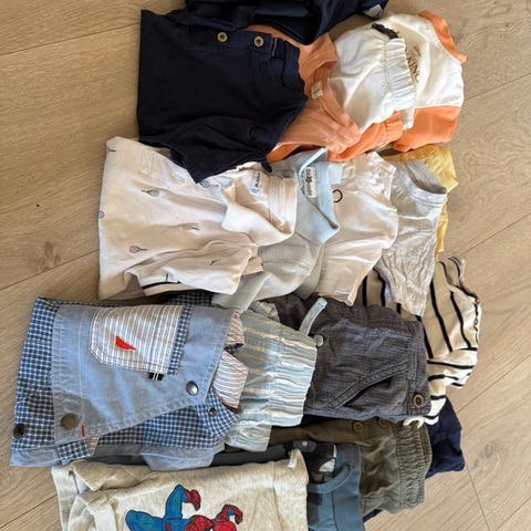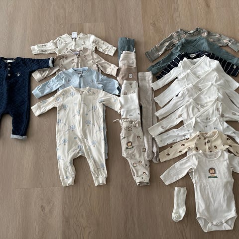 Klespakke til baby str 62. Noen av klærne er merket med str 68/74 men er da små i str og brukt i samme periode som 62