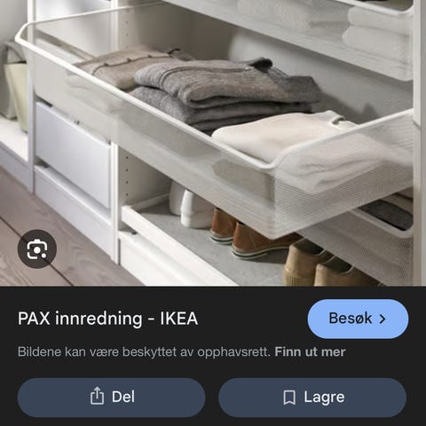 Selger 4 stk PAX skap fra IKEA med mål for hver stamme: 100X58X36, med skyvedører. Som da altså totalt blir 400x66x238 cm (det er med skinner og skyvedørene). Skyvedører Hasvik.