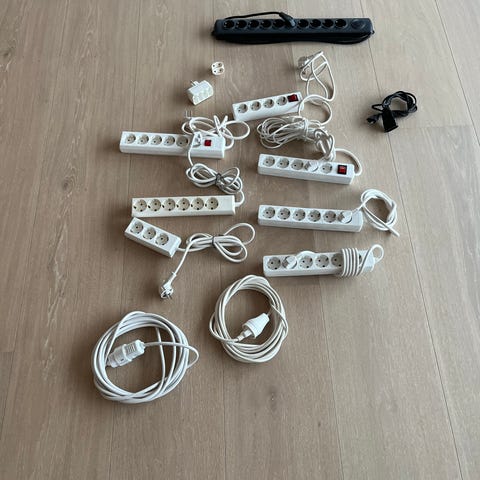 Strømforgrener med flere uttak i hvit plast. Bildet viser flere grenuttak med jordede stikkontakter og ledning med støpsel for vanlig veggkontakt. Noen av grenuttakene har av/på-bryter. Egner seg til å koble til flere elektriske apparater i samme stikkontakt der det er behov for ekstra uttak innendørs.