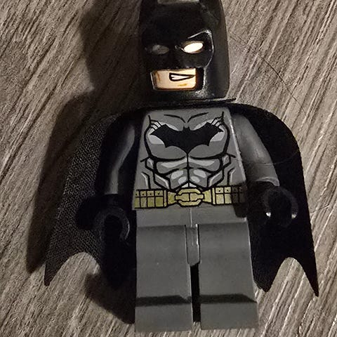 Detaljer: Figuren har en rød hette med et gyllent emblem i pannen, og en svart torso med røde og gylne detaljer som forestiller en kimono.