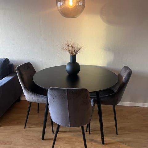 Godt brukte stoler som fortsatt ser veldig fine ut. På to av stolene så har beina løsna litt i feste under. Dette bør fikses men vi har brukt de slik i flere måneder, så de funker fortsatt. Selges samlet