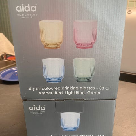 Selger 2 pk ubrukte glass (knut tatt ut av eske for å vise), dvs fire drikkeglass.