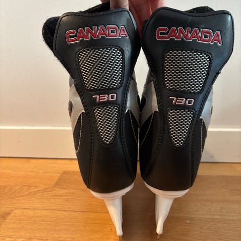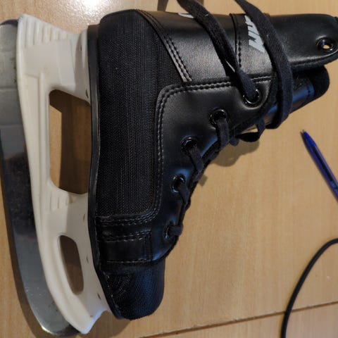 Trex Toronto skøyter for barn i størrelse 31. Skøytene har svart overdel med hvite lisser og hvit skøytestål. Modellen har høy ankelstøtte og polstret pløse for økt komfort. Egner seg til generell bruk på is, som lek og enkel skøyteaktivitet for barn.