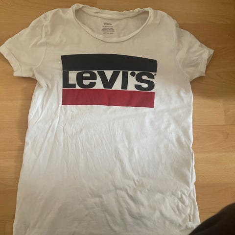 Levi's T-skjorte for dame i størrelse XS. T-skjorten er hvit og laget av bomull. Den har kort erm og rund hals. Fronten har klassisk Levi's-logo i rødt med hvit skrift, og det er en liten rød Levi's-lapp i sidesømmen. Passer som hverdagsplagg alene eller under genser og jakke.