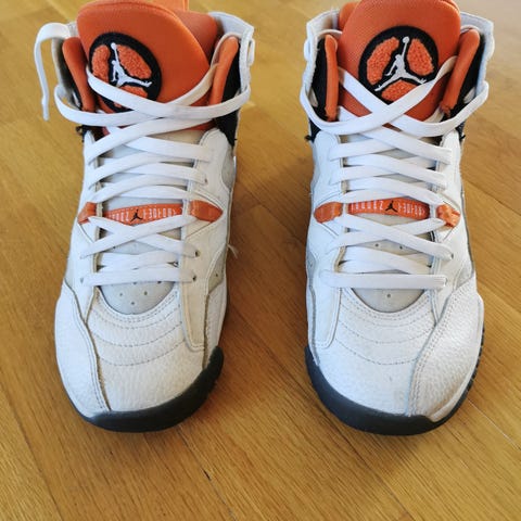 Nike Air Jordan 7 basketsko i størrelse 45. Høyt skaft med snøring og polstret krage. Overdel i hovedsakelig hvitt materiale med detaljer i mørk blå, rød og gule mønstre. Yttersåle i gummi med mønster tilpasset bruk på basketballbane. Skoene er egnet til basketball og kan også brukes som fritidssko.