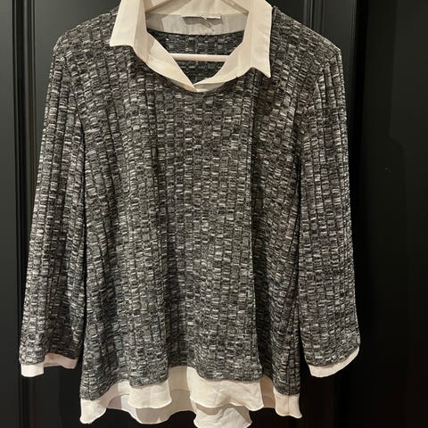 Tøff genser topp i kult mønster. Halsen er spesiell med dobbelt tykkelse og står tøft opp.