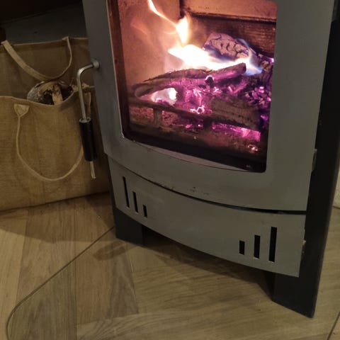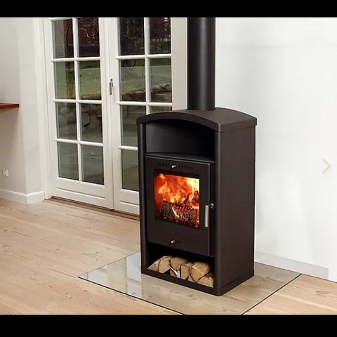 Frittstående vedovn med glassdør i front og brennkammer foret med ildfaste plater. Ovnen har luftinntak i front og askeskuff nederst. Det følger med røykrør og bend som vist på bildene.
