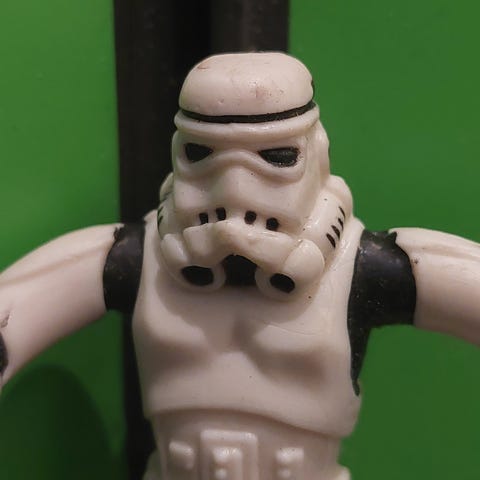 Hvit Pauldron: Den hvite skulderkappen (pauldron) indikerer figurens rang, ofte assosiert med en sersjant eller troppleder i Sandtrooper-enheten.