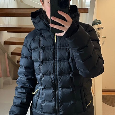 Johaug dunjakke for dame i størrelse L. Jakken er gul med vattert dunkonstruksjon og har ribbestrikkede kanter ved ermer og nederkant. Den har glidelås i front og to sidelommer med glidelås. Innsidefôret er mørkt med mønster. Egner seg som ytterjakke i kjøligere vær.