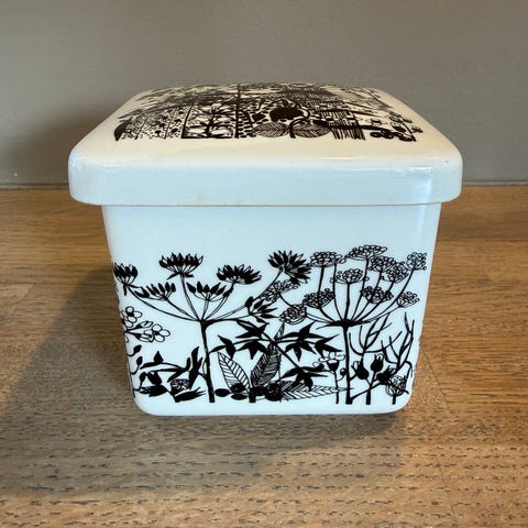Kvadratisk smørkrukke fra Figgjo i motivet Heliotrope. Krukken er i svært god stand uten nag og krakeleringer. Den har et merke i bunnen, men dette er ikke gjennomgående. Såvidt antydning til svak misfarging på kanten av krukken. Synes knapt, og selvfølgelig helt usynlig når lokket står på.