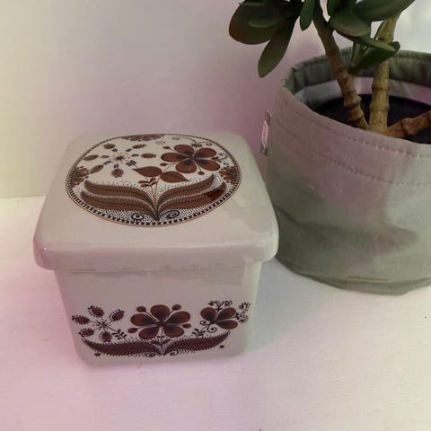 Søkeord: retro, vintage, midcentury, modern, porselen, servise, Figgjo, fidjo, krukke, butt, skål, smør, firkantet, kvadratisk, Heliotrope, Helio, trope, samleobjekt, flint, fayanse