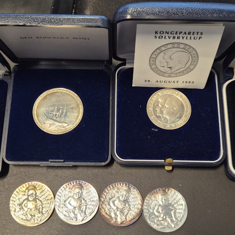 To av medaljene ligger i etui, én i løs blå lomme. Motivene inkluderer blant annet en medalje merket «Posten 350 år 1647–1997» med postmotiv, samt to portrettmedaljer. Medaljene er runde og preget med relieff på forsiden. Egner seg som samleobjekter for mynter og medaljer eller som historiske minneobjekter.