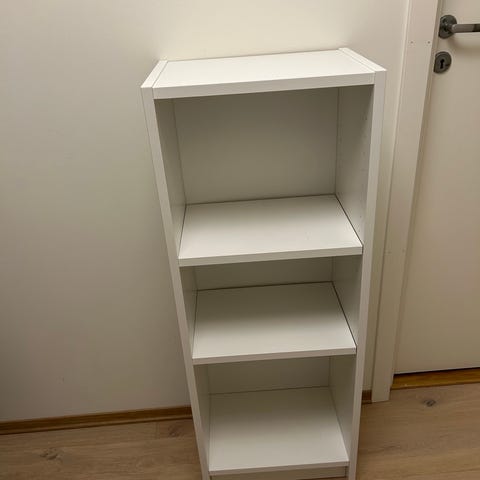 Selger en hvit og pen Kallax-hylle med en tilhørende skuff i sort stoff.
