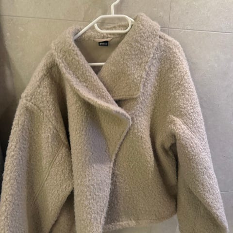 Gina Tricot jakke for dame i størrelse L. Jakken er grå og laget i polyester. Modellen har høy krage og knappelukking foran. Rett og noe kort fasong, med lange ermer. Egnet som ytterjakke i overgangssesonger eller milde dager.