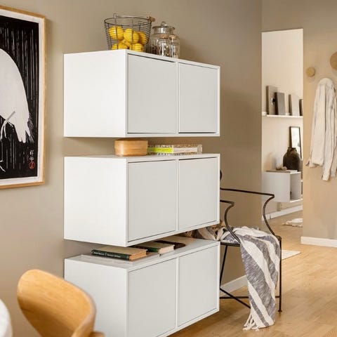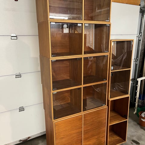 Pent brukt Bolia case oppsett i valnøtt selges samlet. 4 separate enheter. Modulene kan settes opp etter ønske/eller henges/festes på veggen. Se bildet av baksiden til modulfeste.