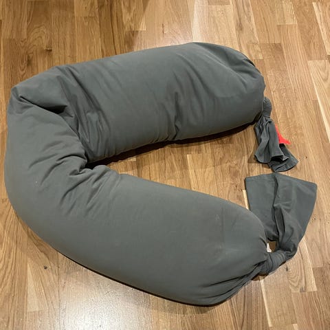 Bbhugme gravidpute i olivengrønn farge. Puten består av et langt, fleksibelt rør fylt med små kuler som former seg etter kroppen. Yttertrekket er i mykt tekstil og kan justeres med strammelåser i begge ender for å tilpasse fasthet og lengde. Egnet som støttepute under graviditet og ved amming, samt som avlastning for rygg, mage og hofter i liggende eller sittende stilling.