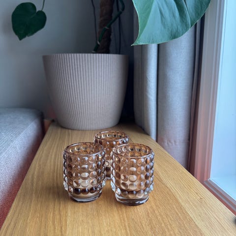 To telysestaker i glass. 7,5 cm og 11 cm høyde. Kjøpt på studio MM. Selges samlet
