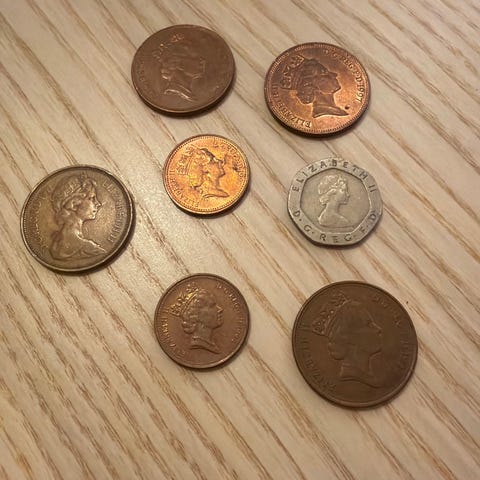 8 stk 2 pence og 5 stk one penny.