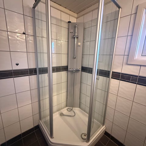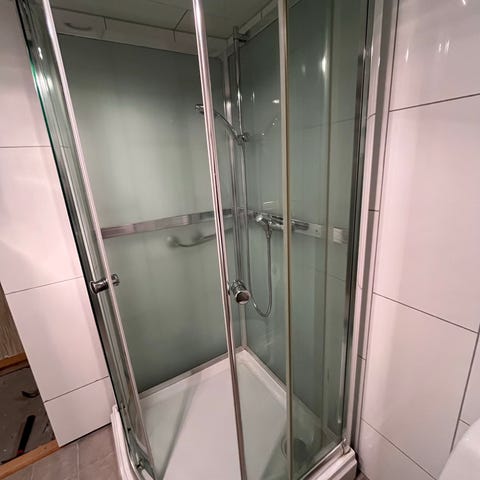 Dusjkabinett i hvit utførelse med klare glass og hjørneløsning. Kabinettet har skyvedør, integrert dusjstang og hånddusj, samt hylle til såpe og toalettartikler. Passer til montering i hjørne på bad eller vaskerom der man ønsker en avgrenset dusjsone med glassvegger og dusjkar.