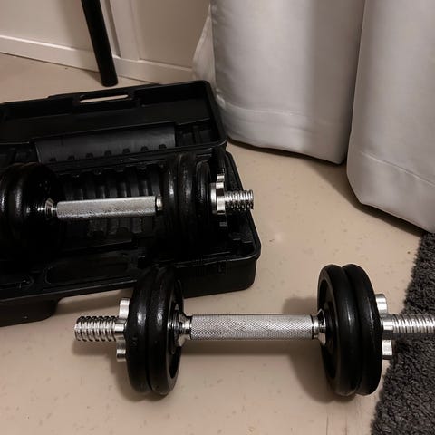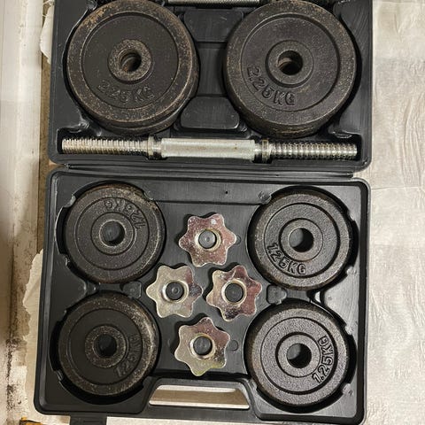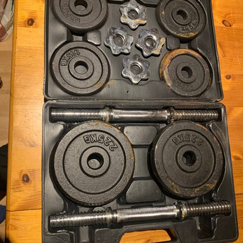 15 kg Exerfit dumbbell sett med koffert. Settet består av to manualstenger med gjenger og flere vektskiver i støpejern. Leveres i plastkoffert for oppbevaring og transport. Egnet til styrketrening av overkropp, armer og skuldre hjemme eller på treningsrom.