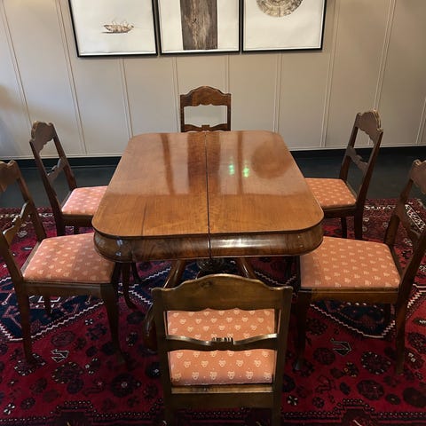 Flott mahogny spisebord selges. Selges med to ileggsplater a 37,5cm. Lengde er 125 cm, men kan bli 200cm.