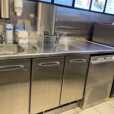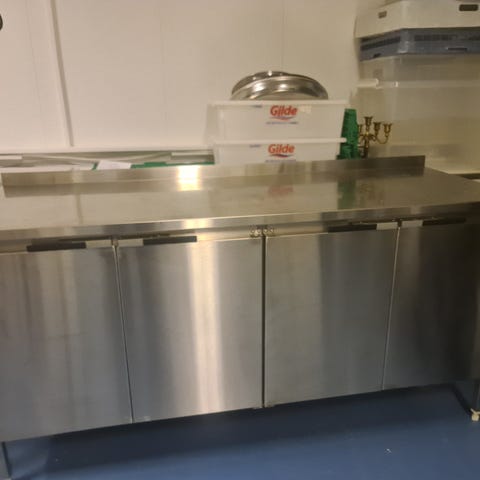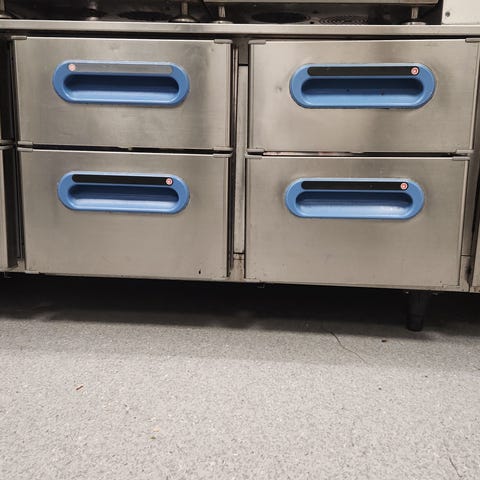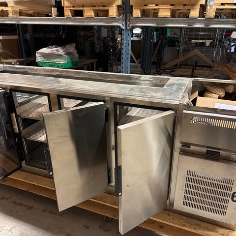Rustfri arbeidsbenk til storkjøkken med integrerte underskap og skuffer, 3 fryseskuffer og kjøleskap. Benken har flere skuffer og skap for oppbevaring av kjøkkenutstyr og råvarer. Overflaten er i rustfritt stål som er egnet for mattilberedning og enkel rengjøring. Løsningen passer for profesjonelle kjøkken, serveringssteder og andre næringsmiddelmiljøer som trenger robust arbeidsflate og lagringsplass i ett møbel.