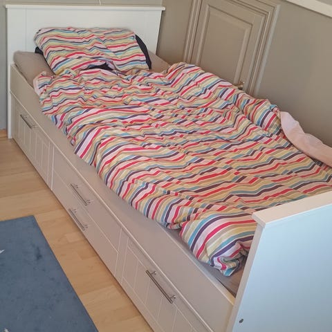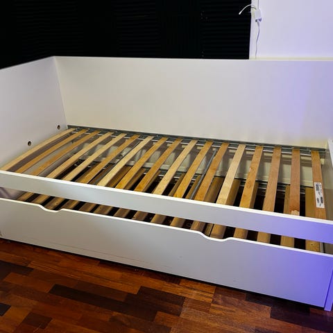 IKEA dagseng i hvit utførelse med tre uttrekksskuffer under liggeflaten. Sengen har rygg- og sidepanel som gjør at den kan brukes både som seng og som sofa på dagtid. Skuffene gir ekstra oppbevaringsplass for sengetøy, klær eller leker. Passer til ett madrassmål i standard enkeltsengstørrelse. Egnet til bruk på soverom, barnerom eller gjesterom.