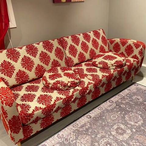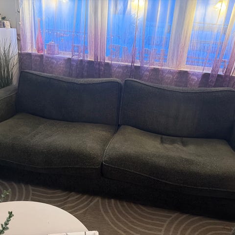 Godt brukt men mye bruk igjen. God å sitte i. Billig pris fordi ene foten er løs. Den har bare falt ut når jeg har flyttet på den og det er enkelt å sette den på plass, men man bør ikke herje for mye i sofaen for da kan den falle hoppe ut. Har brukt den i 3 år og det har ikke vært et problem😊