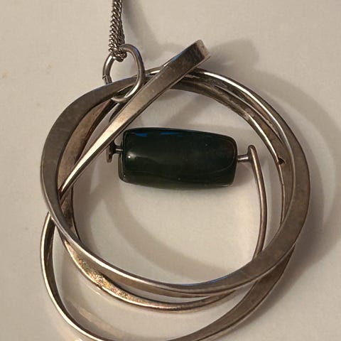 Håndlaget modernistisk avantgarde design i noe jeg tror er forsølvet tinn med semiedelstener ( amethyst og ukjent grønn sten ).